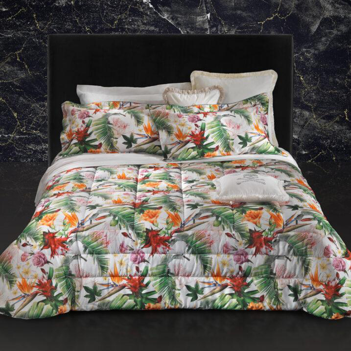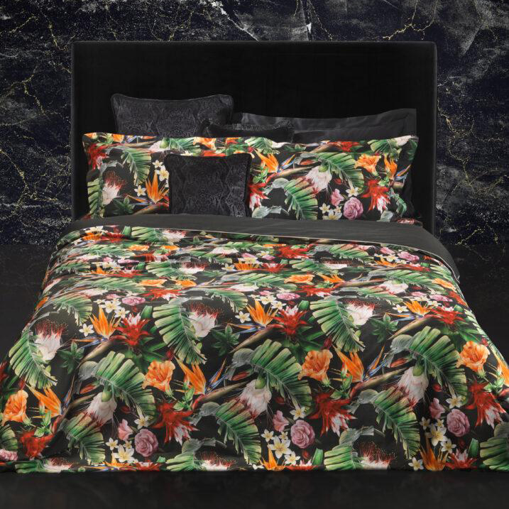 Every detail reflects the aesthetics of a brand that celebrates the philosophy of “more is more.” Velvet sateen, fine cotton sateen and jacquards are enhanced with striking features: glossy prints, embroidered logos, golden touches and rock-’n-roll motifs. Each duvet cover, pillowcase or throw becomes an exclusive artifact — a fusion of extravagance, craftsmanship and unmistakable allure.